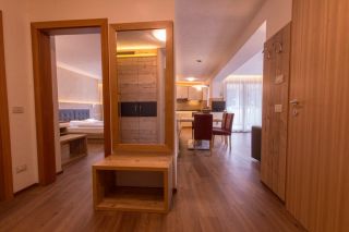 Zweizimmer-Appartement zu 56 m² für 4-5 Personen, superior Klasse. Großzügiger Vorraum mit Schränken und Garderobe. Helles und gemütliches Wohnzimmer mit Eckbank und Tisch, Schlafcouch und eine große Küche komplett ausgestattet mit Besteck, Geschirrspüler, Kühl- und Gefrierschrank, Glaskeramik-Elektroherd. Große Terrasse zu 10 m2 mit Blick auf Süd-Ost mit Zugang zum Garten, Tisch mit Stühlen, Wäscheständer. Separates Schlafzimmer mit Doppelbett oder zwei Einzelbetten, Tisch mit Sitzbank, eventuell in 3. Schlafplatz umformbar, Zusatz- bzw. Kinderbett auf Anfrage, Panoramafenster zum Garten. Badezimmer mit Dusche, Bidet, Waschbecken und WC, Föhn Handtuchwärmer. 43 Zoll LED-Fernseher mit terrestrischen Sendern und Satellitsendern, LCD-Fernseher im Schlafzimmer, Telefon, kostenlose Internetverbindung via LAN-Kabel oder Wireless, Wandsafe, Staubsauger, Bettwäsche, Handtücher und Geschirrtücher vervollständigen die Ausstattung der Wohnung.