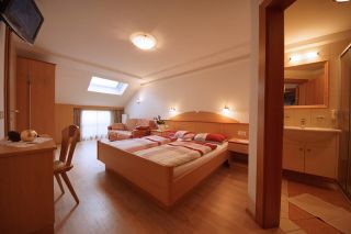 Zimmer zu 24 m² für 1-3 Personen, Erdgeschoss, nach Süd-Westen ausgerichtet mit Doppelbett, Tisch mit Stuhl, Couch, eventuell in 3. Schlafplatz umformbar, und Dachfenster. Badezimmer mit Dusche, Bidet, Waschbecken und WC, Föhn und Handtuchwärmer. LCD-Fernseher, SAT, Telefon, kostenlose Internetverbindung via LAN-Kabel oder Wireless, Wandsafe, Bettwäsche und Handtücher vervollständigen die Ausstattung des Zimmers.